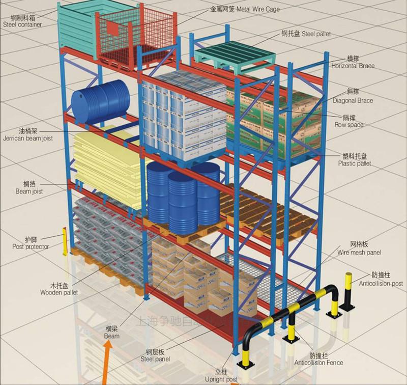 Heavy shelves by columns, beams, transverse bracing, bracing and self-locking bolt assembly, can effectively prevent the loosening of the bolts caused shelf instability; the crossbeam adopt special cold rolling P type closed beam; the structure is simple and reliable, light weight, bearing capacity and low cost characteristics of; column card and column connection with special design the safety pin, you can ensure that the beam impacted by external force and will not fall off; laminates using the strip plate, with bearing capacity is strong, wear-resistant, replacement simple, low maintenance cost.
