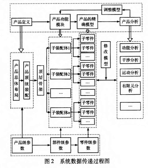 最后筆者進(jìn)行產(chǎn)品分析,若滿足全部設(shè)計(jì)要求,通過 Solid Works三維圖和工程圖之間的信息傳遞的特點(diǎn)和建立的工程圖的模板,進(jìn)行工程圖生成。若不滿足要求,則通過修改模型達(dá)到要求后,進(jìn)行工程圖生成。系統(tǒng)數(shù)據(jù)傳遞過程圖如圖2所示。