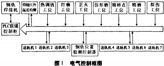 (2)電氣部分技術原理:電氣控制系統(tǒng)主要由:紅外光電傳感器、紅外溫度傳感器、接近開關,可編程控制器、變頻器、繼電器等組成,在送軌機上裝有紅外溫度傳感器和紅外光電傳感器、生產線的各工位上安裝了鋼軌運行位置檢測傳感器和工作狀態(tài)檢測以及工作結束操作按扭。焊接生產線的工作狀態(tài)通過各工作位置操作面板與總控制柜連接,根據(jù)鋼軌走行位置和工作狀態(tài)檢測信息輸送到可編程控制器,并向鋼軌焊接工位發(fā)送開啟和鎖閉生產線的鋼軌運行信號。電氣控制框圖如圖1。