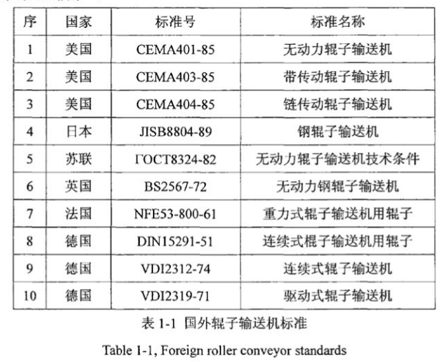 滾筒輸送機(jī)制造業(yè)發(fā)展迅速,各種結(jié)構(gòu)形式的滾筒輸送機(jī)已經(jīng)在生產(chǎn)中得到廣泛應(yīng)用,前蘇聯(lián)、美國、德國、日本等工業(yè)發(fā)達(dá)國家在滾筒輸送機(jī)的研究方面都有一定的進(jìn)展。近年來滾筒輸送機(jī)的制造技術(shù)早已進(jìn)入了成熟階段,并形成了專業(yè)化和規(guī);纳a(chǎn),它的通用和專用產(chǎn)品均有較多的類型,規(guī)格品種比較齊全,而且結(jié)構(gòu)型式多種多樣,因此可以滿足各行各業(yè)生產(chǎn)的需要。同時(shí),這些國家也十分重視滾筒輸送機(jī)的標(biāo)準(zhǔn)化工作,從二十世紀(jì)五十年代起,這些國家就開始投身于制定滾筒輸送機(jī)標(biāo)準(zhǔn)的工作,經(jīng)過不斷地更新和完善,實(shí)現(xiàn)了規(guī)范并推動(dòng)滾筒輸送機(jī)在生產(chǎn)制造中的標(biāo)準(zhǔn)化、系列化和通用化的目的,而且保證和促進(jìn)了滾筒輸送機(jī)的制造質(zhì)量和技術(shù)水平。國外輥?zhàn)虞斔蜋C(jī)標(biāo)準(zhǔn)見表1.1所示。