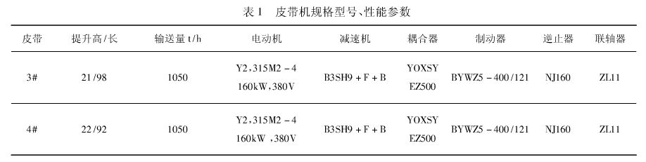 輸煤系統(tǒng)所用3#、4#皮帶輸送機(jī)輸送能力10501/h,采用電機(jī)驅(qū)動(dòng)液力耦合器減速機(jī),減速機(jī)驅(qū)動(dòng)皮帶,工況為間歇運(yùn)行,根據(jù)鍋爐系統(tǒng)需求每班上煤時(shí)間約2~3h,具體配置如下表1。