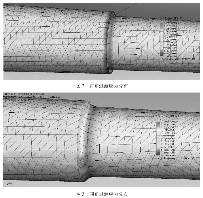 1、從軸斷裂截面處分析,發(fā)現(xiàn)在斷裂的軸肩過渡部位為直角,基本沒有圓滑過渡,極易造成應(yīng)力集中。如下圖扭矩受力分析圖,軸徑Φ80過渡至Φ75,圖2為直角過渡,圖3為R5圓角過渡,在承受相同扭矩載荷下,可以看出直角部位因截面形狀突然改變,造成應(yīng)力集中,而圓角平滑過渡就可避免應(yīng)力集中。